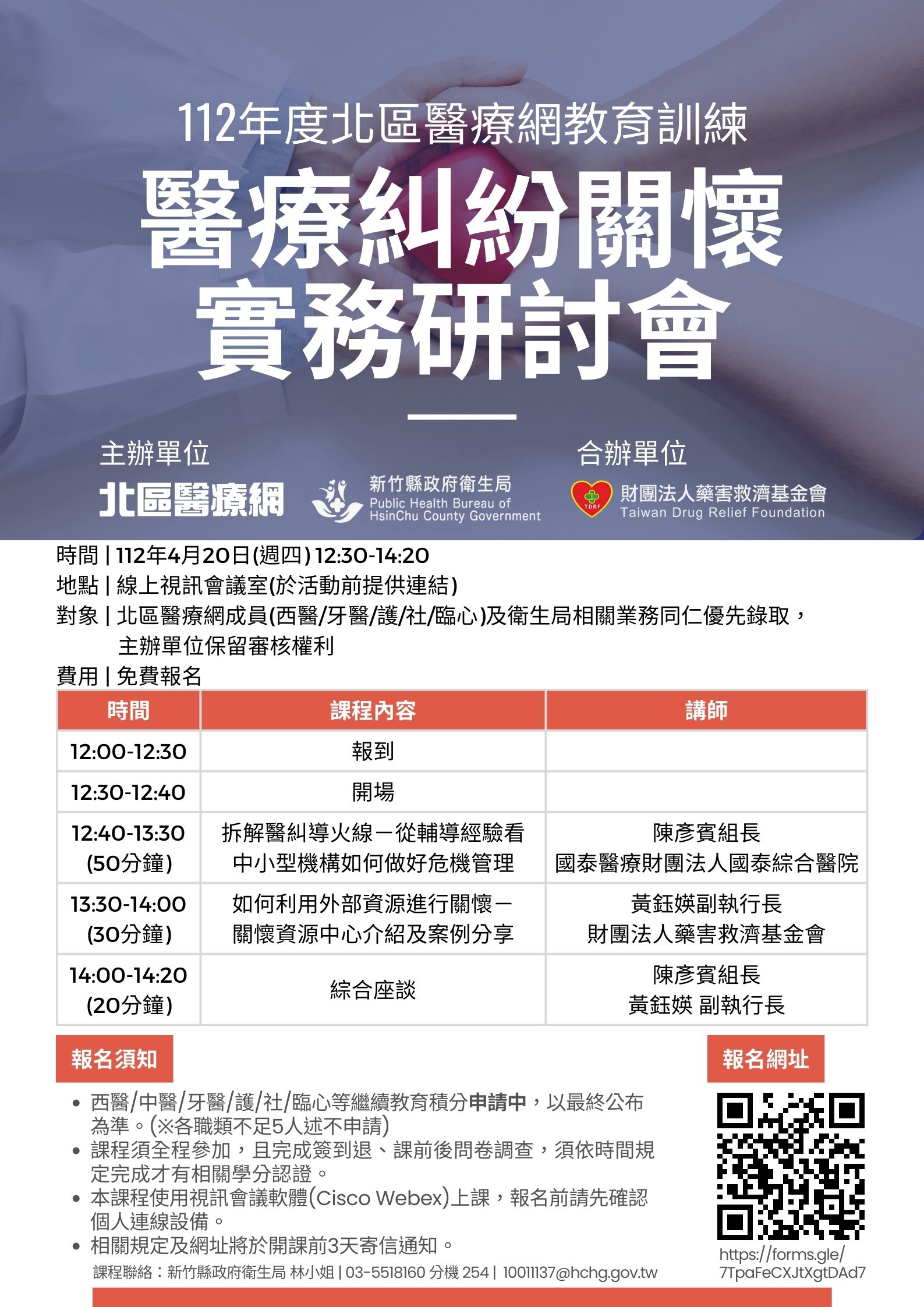 112年4月20日、4月27日『112年度北區醫療網教育訓練「醫療糾紛關懷實務研討會(直播課程)」及「醫療爭議處理實務研討會(實體課程)」』-新竹縣政府衛生局、財團法人藥害救濟基金會 |