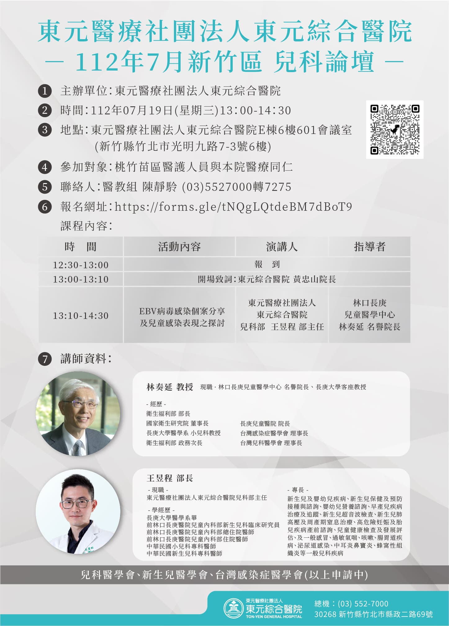 112年7月19日「112年7月新竹區兒科論壇」-東元綜合醫院 |