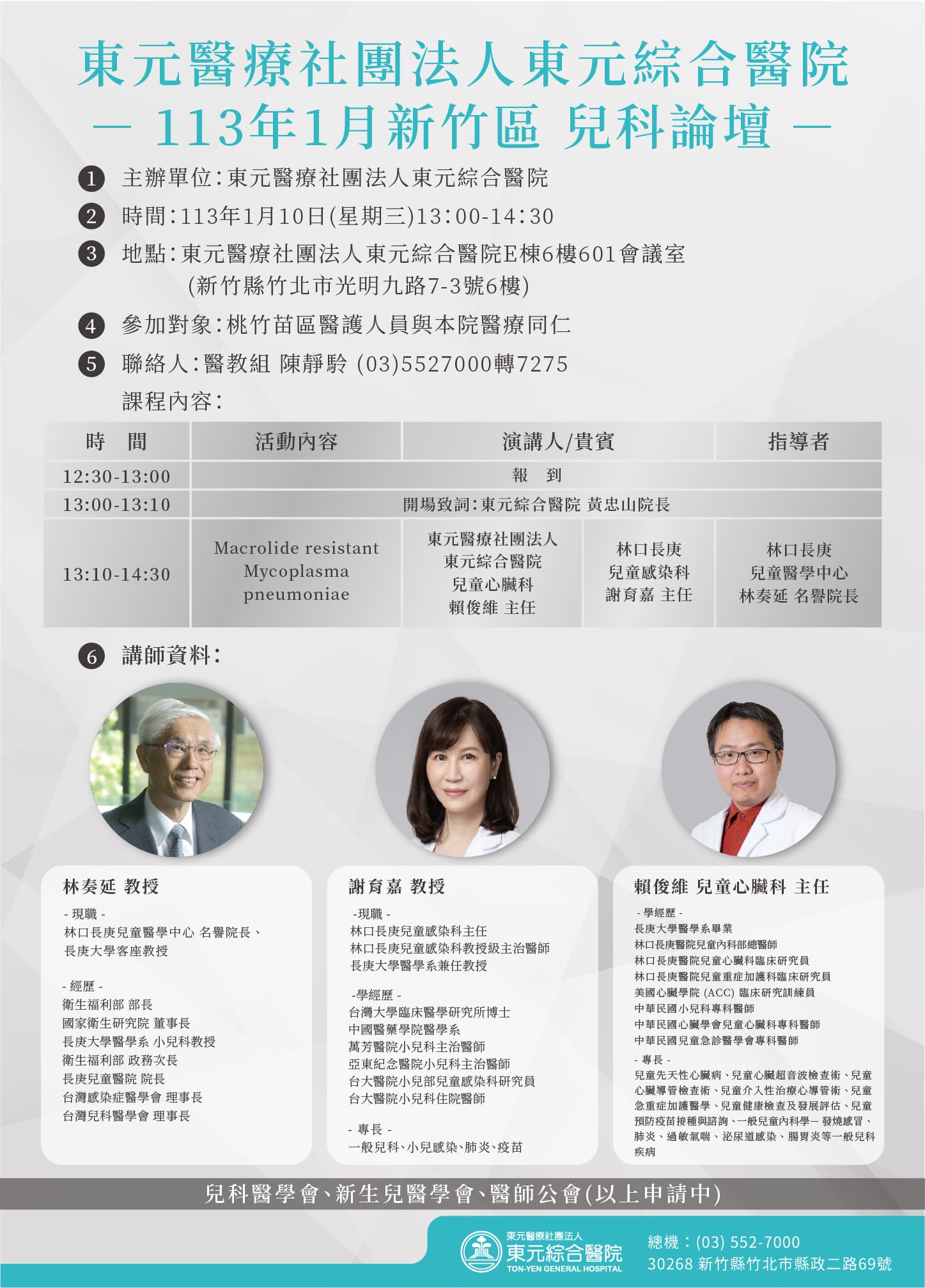 113年1月10日「113年1月新竹區兒科論壇」-東元醫療社團法人東元綜合醫院 |