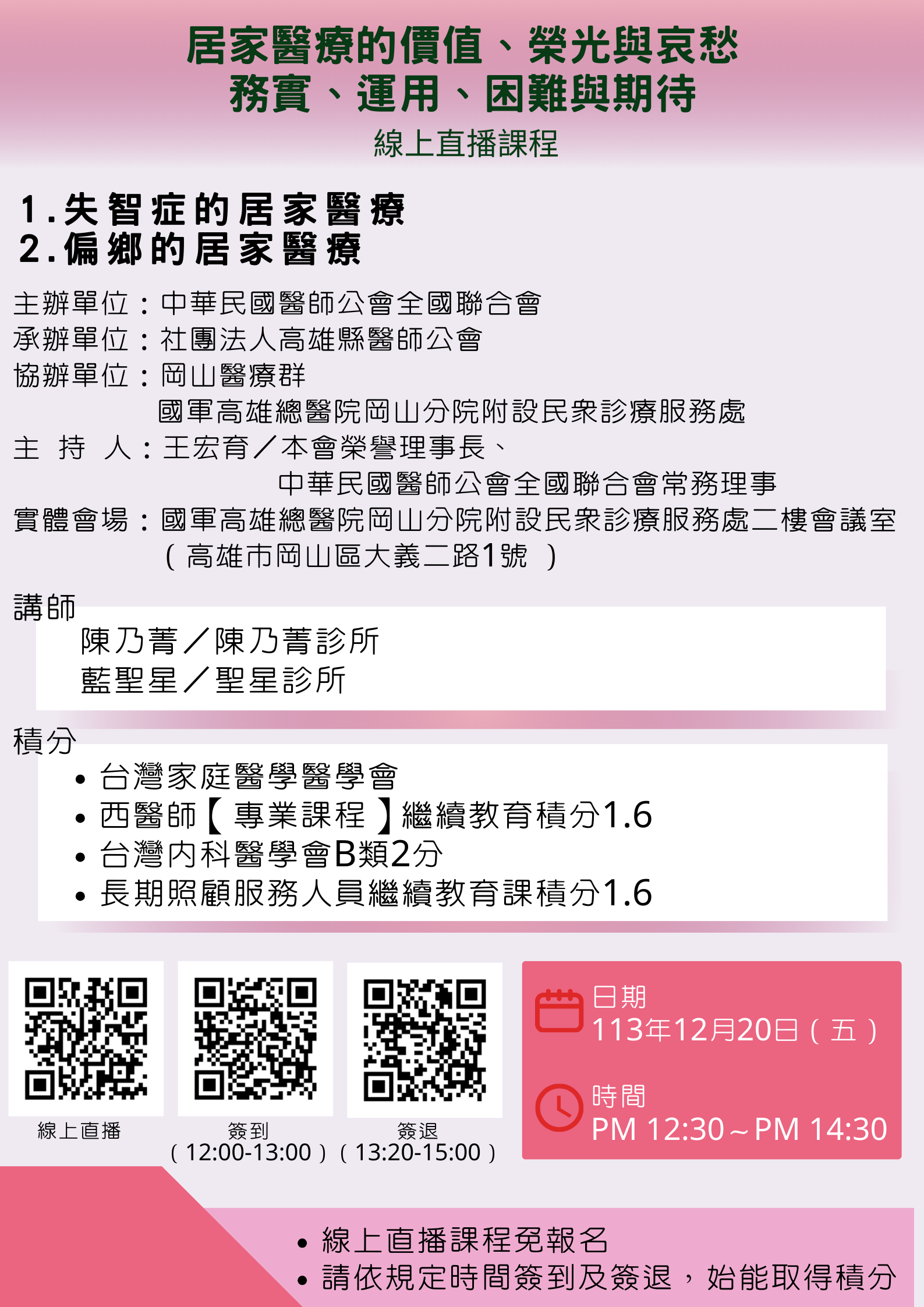 | 113年12月20日「居家醫療的價值、榮光與哀愁--務實、運用、困難與期待:1.失智症的居家醫療2.偏鄉的居家醫療」線上直播課程-高雄縣醫師公會 | ||||||||||||||