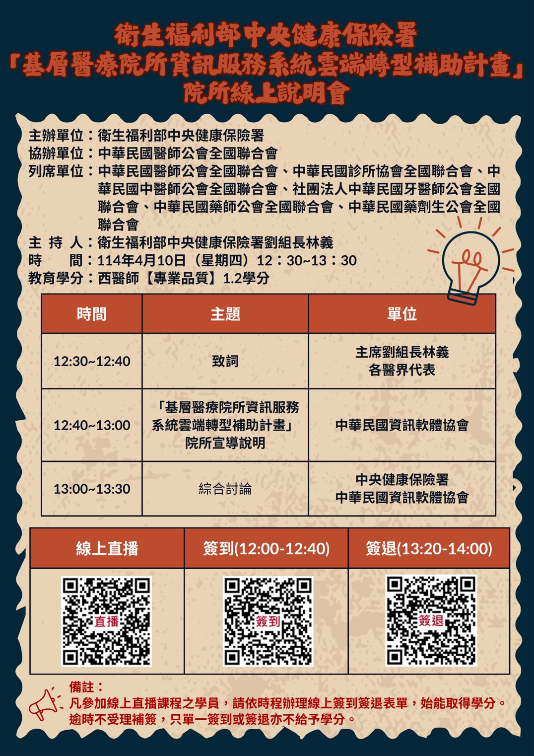 | 114年4月10日「基層醫療院所資訊服務系統雲端轉型補助計畫」院所線上說明會直播課程-衛生福利部中央健康保險署、全聯會 | ||||||||||||||