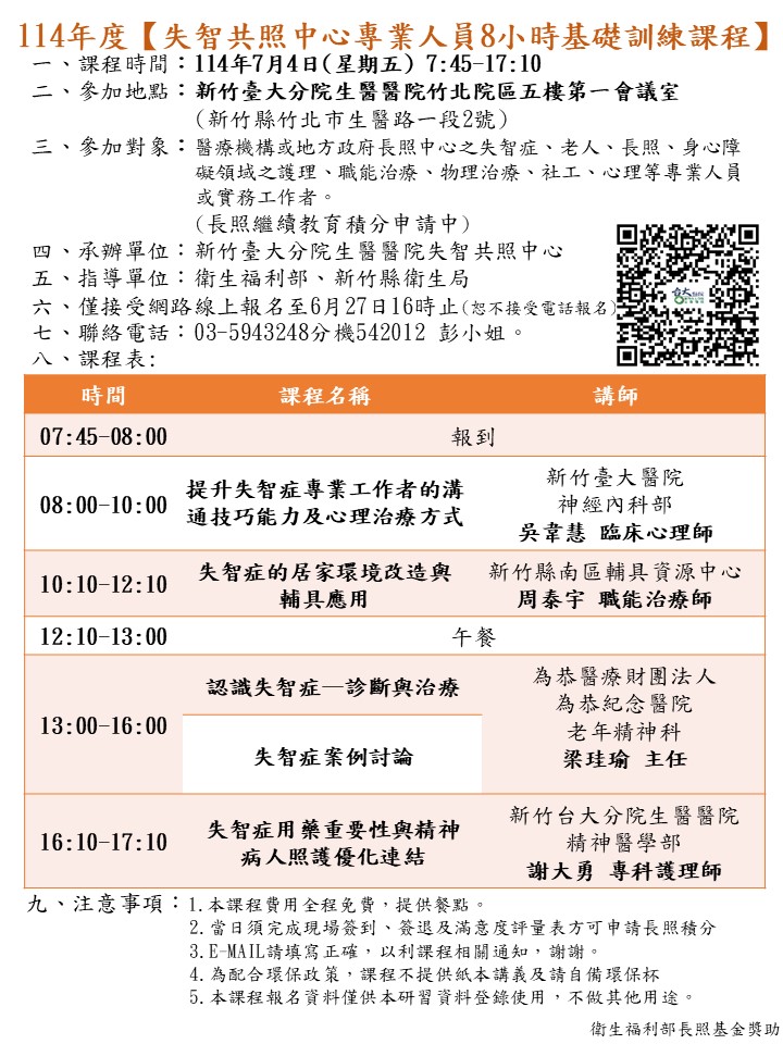 | 114年7月4日「114年失智共照中心專業人員8小時基礎訓練課程」-國立臺灣大學醫學院附設醫院新竹臺大分院生醫醫院 |