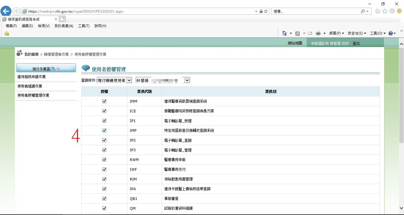 無健保卡查詢入境、接觸史資料,需由VPN首頁機構管理者先進行人員授權作業,授權步驟畫面如下: 1. 機構管理者作業