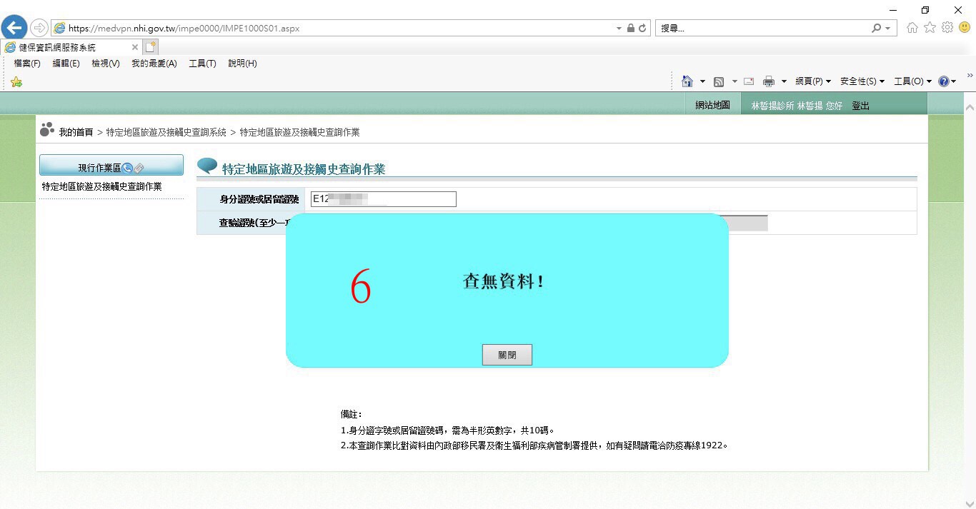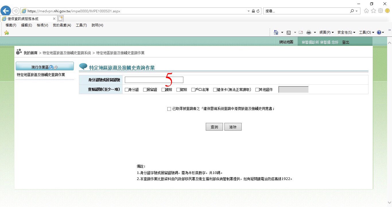 7. 在服務項目中的「特定地區旅遊及接觸史查詢系統」輸入身分證或居留證、護照號碼查詢