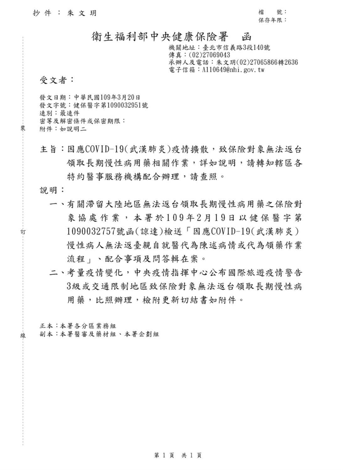 慢性病人委託他人代為陳述病情或代領藥事項,原僅針對滯留「中港澳地區」,考量疫情變化,已調整為「中央疫情指揮中心公布國際旅遊疫情警告3級或交通限制地區」,檢附今日發函(如下圖),切結書可於本署全球資訊網:首頁>重要政策>武漢肺炎就醫領藥>因疫情無法返台慢性病人領取長期慢性病用藥作業項下載。
