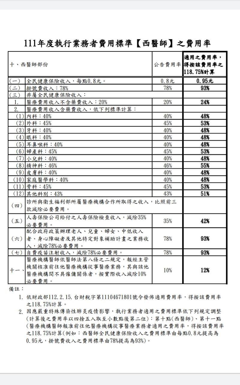 轉發財政部112.02.15公告「111年度執行業務者費用標準【西醫師】之費用率」。