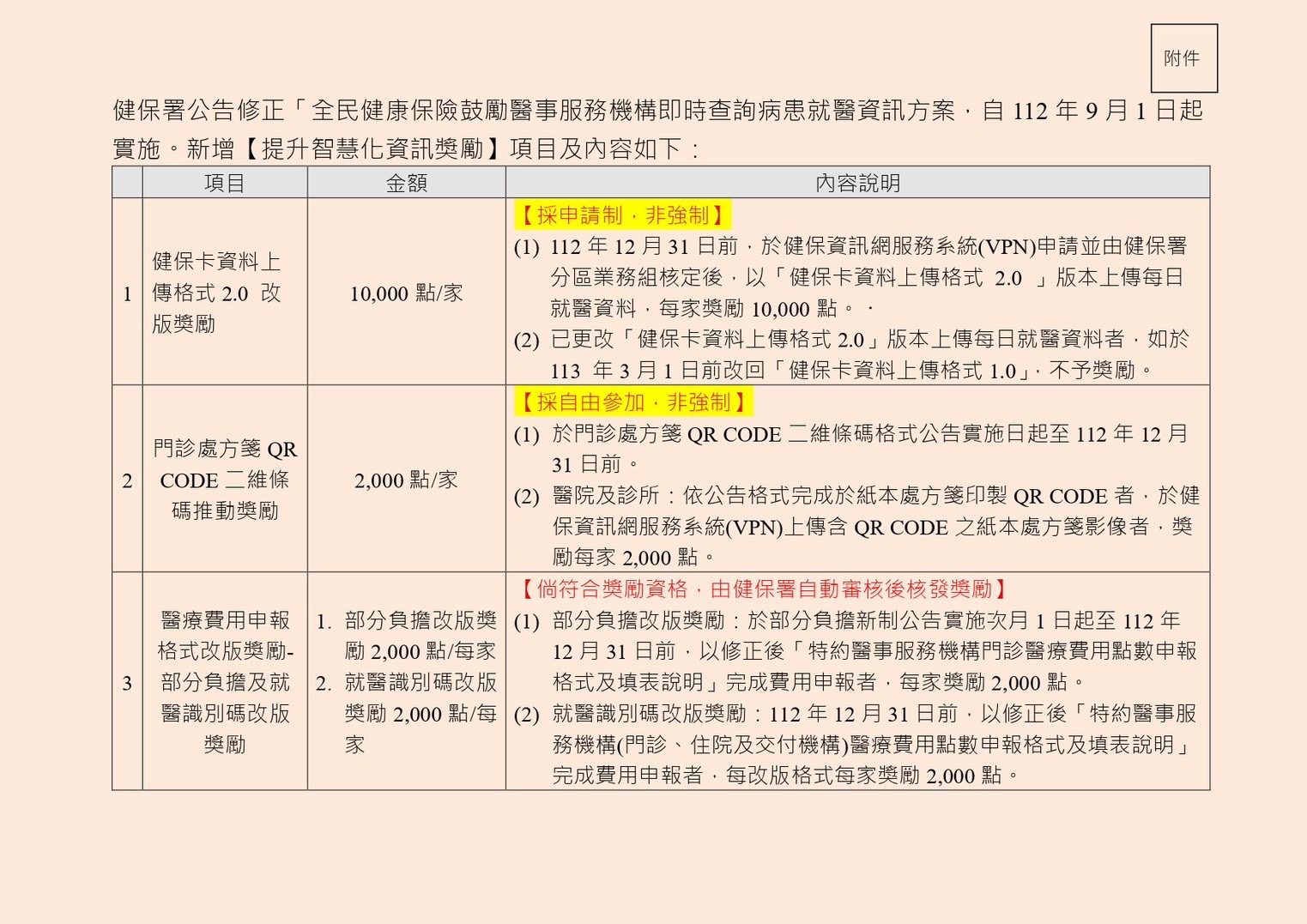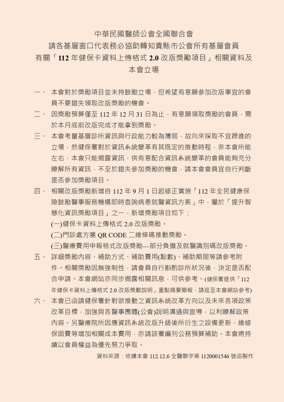 | 有關IC健保卡上傳格式2.0,全聯會對於獎勵項目並未持鼓勵立場,但希望有意願參加改版事宜的會員不要錯失領取改版獎勵的機會。獎勵預算僅至112年12月31日前完成改版申報。 | 2023-12-08 |