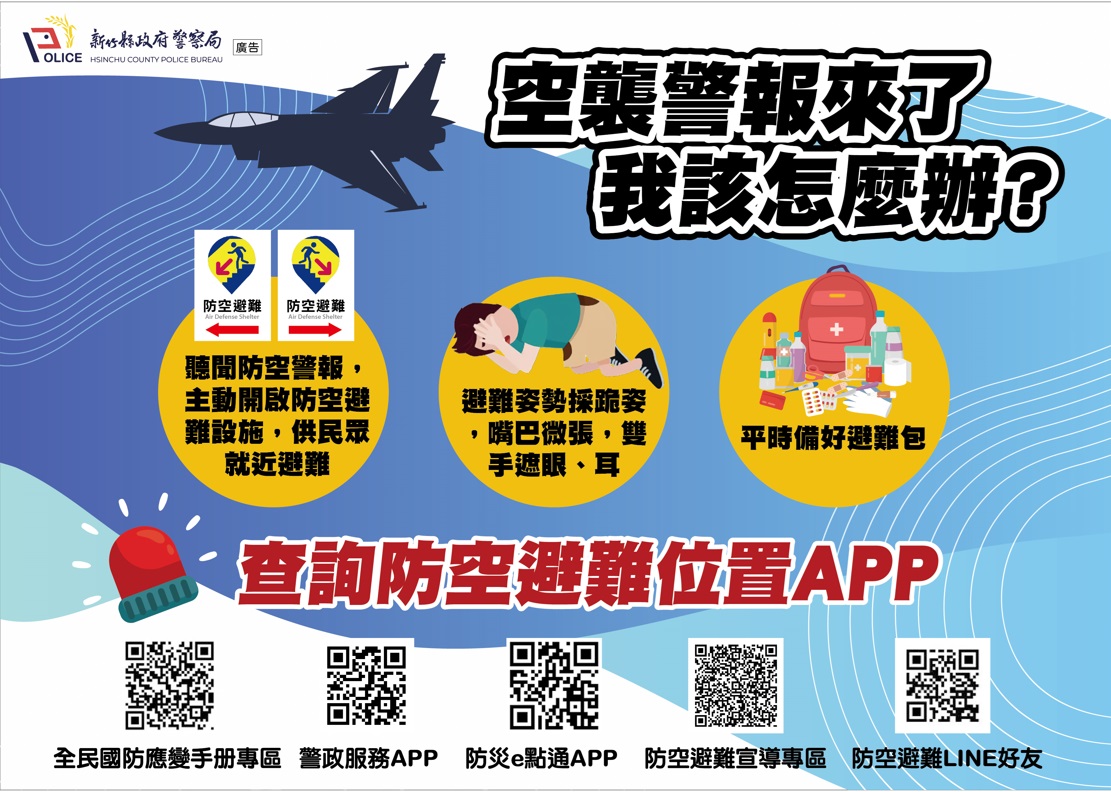 ★民眾可用手機下載警政服務、消防防災E點等APP,或利用新竹縣警察局網站搜尋附近防空避難所