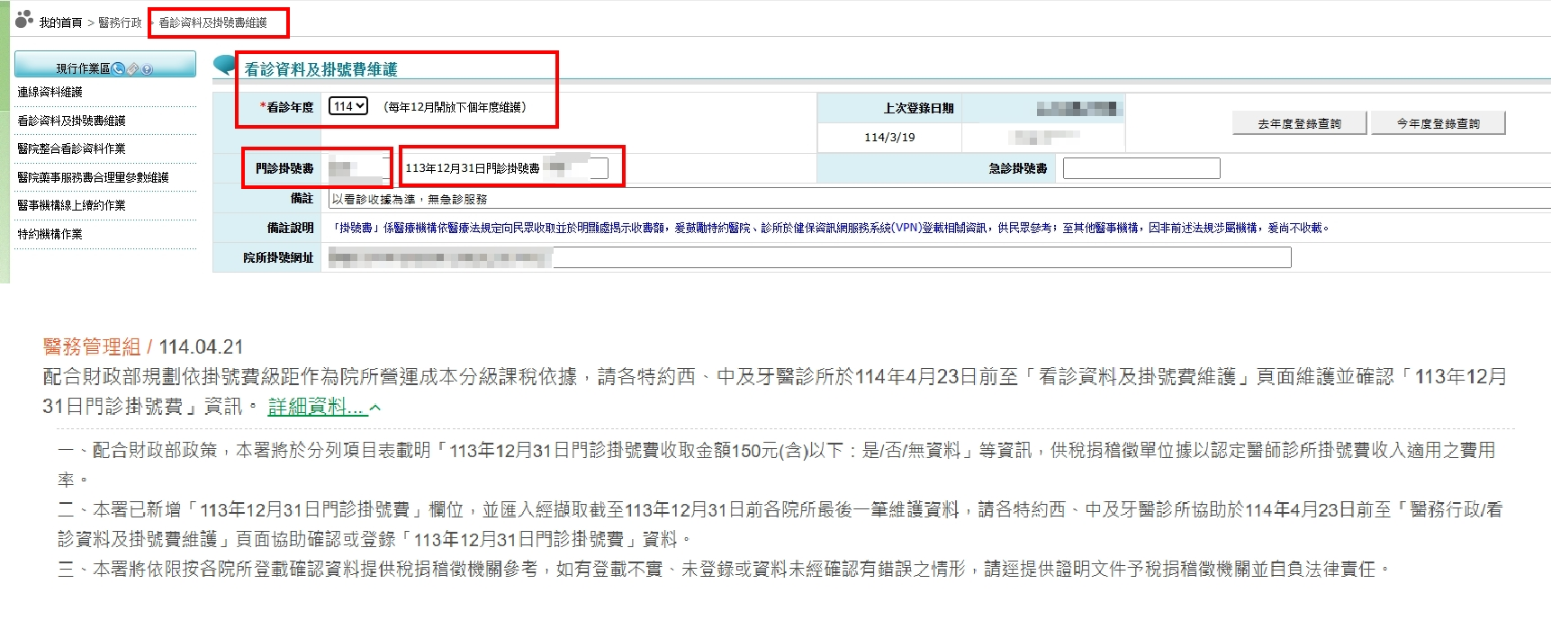★請特約診所於114年4月23日前至VPN系統:「醫務行政/看診資料及掛號費維護」頁面,確認或登錄「113年12月31日門診掛號費」資料。
