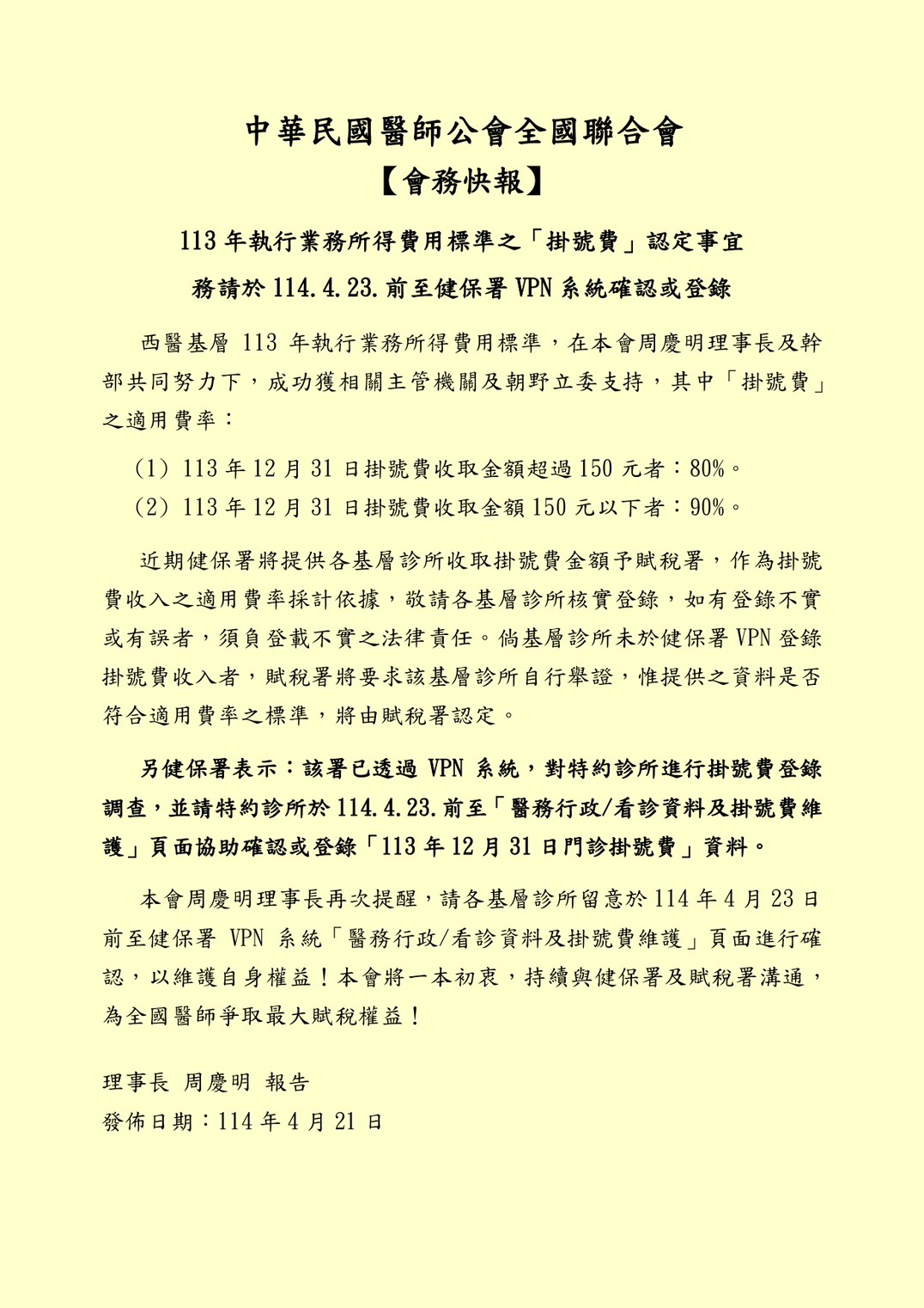 轉知醫師公會全聯會訊息 有關113年執行業務所得費用標準之「掛號費」認定事宜,請合約院所於114.4.23.前至健保署VPN系統確認或登錄掛號費。