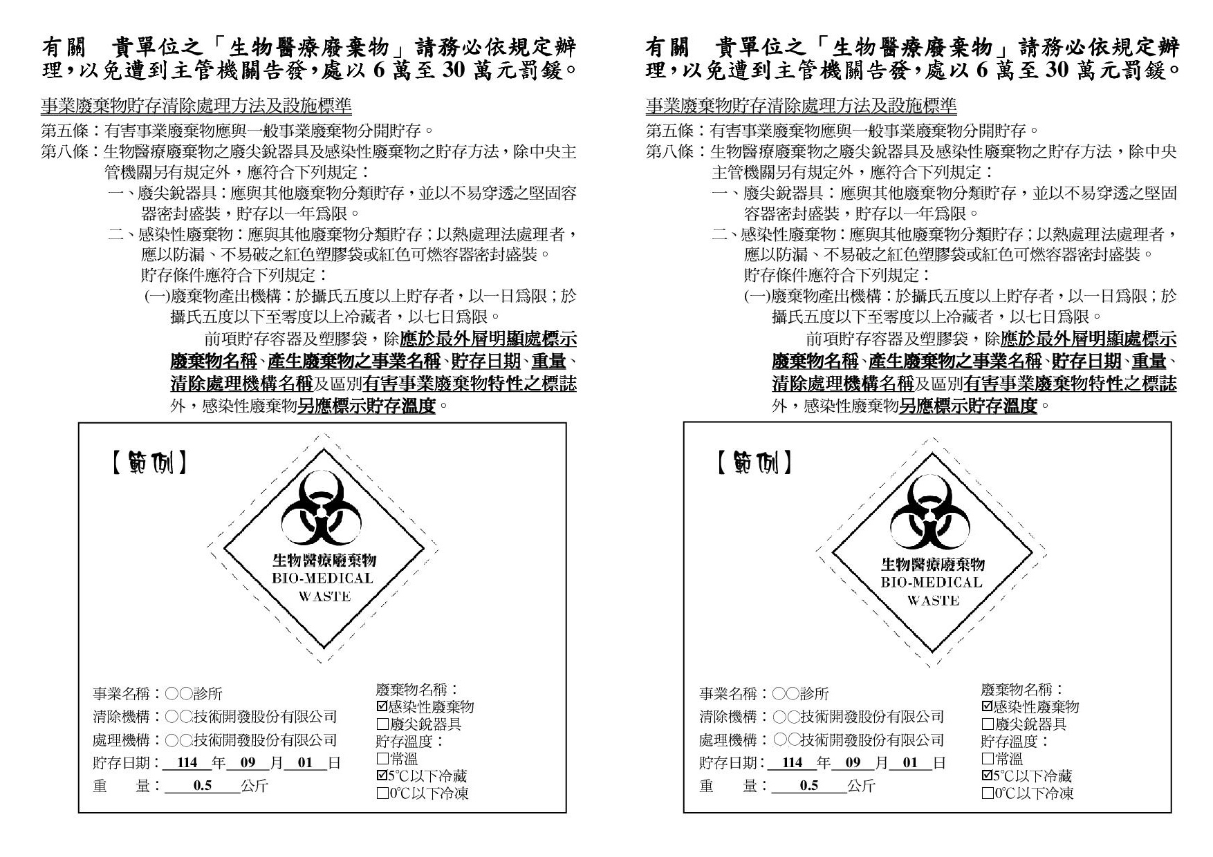 有關醫療廢棄物注意事項:貯存感染性廢棄物之塑膠袋或容器,應於外層明顯處標示清楚診所名稱、日期及重量,如有標示不清楚,近期環保局將會檢查並對違規診所開罰。標示範例如下圖,請各院所依規辦理,以免受罰。