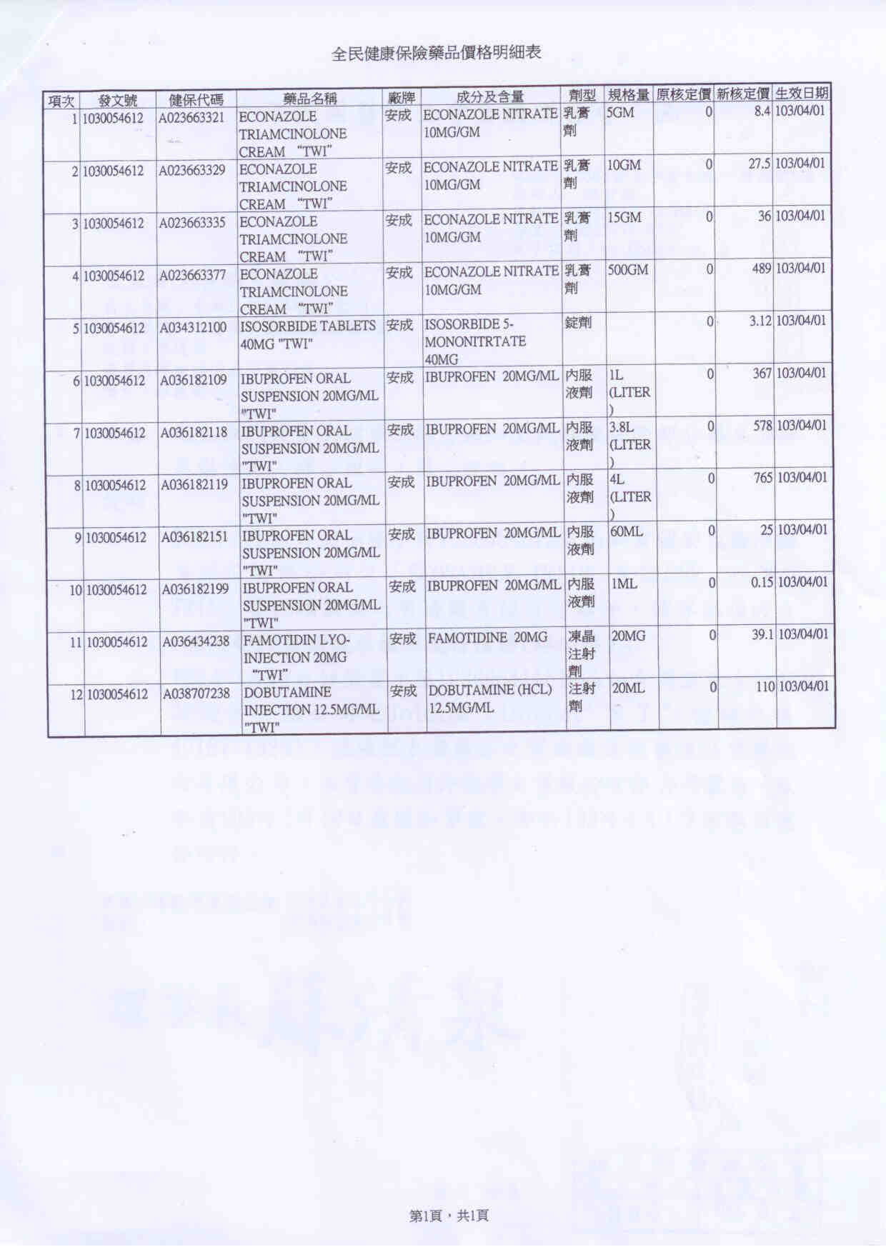 衛福部中央健保署函知全民健康保險部份藥品價格異動情形,詳如說明。 一、103年3月17日健保審字第1030054612號函知有關安成國際藥業股份有限公司之「ECONAZOLE TRIAMCIN OLONE CREAM"TWI"」等12項藥品之製造廠業經許可轉移,該等品項將自103/4/1日回復原健保支付價格,詳附件。 二、103年3月18日健保審字第1030054116函知有關三東生物科技股份有限公司之Toldine ointment"S.T"(健保代碼A018771329),經確認本案藥品之製造廠係龍杏生技製藥股份有限公司,未曾委託內外化學工業股份有限公司製造,故取消103年2月10日原通知事宜,即於103年4月1日不取消健保給付。