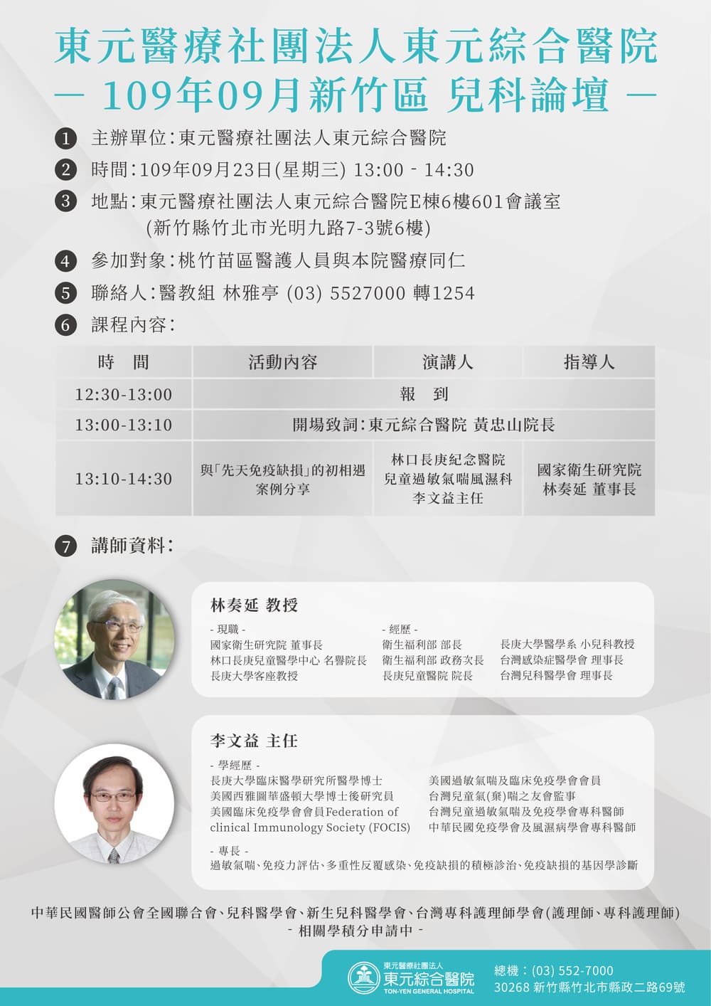 109年9月23日「109年09月新竹區兒科論壇-與『先天免疫缺損』的初相遇案例分享」-東元綜合醫院
