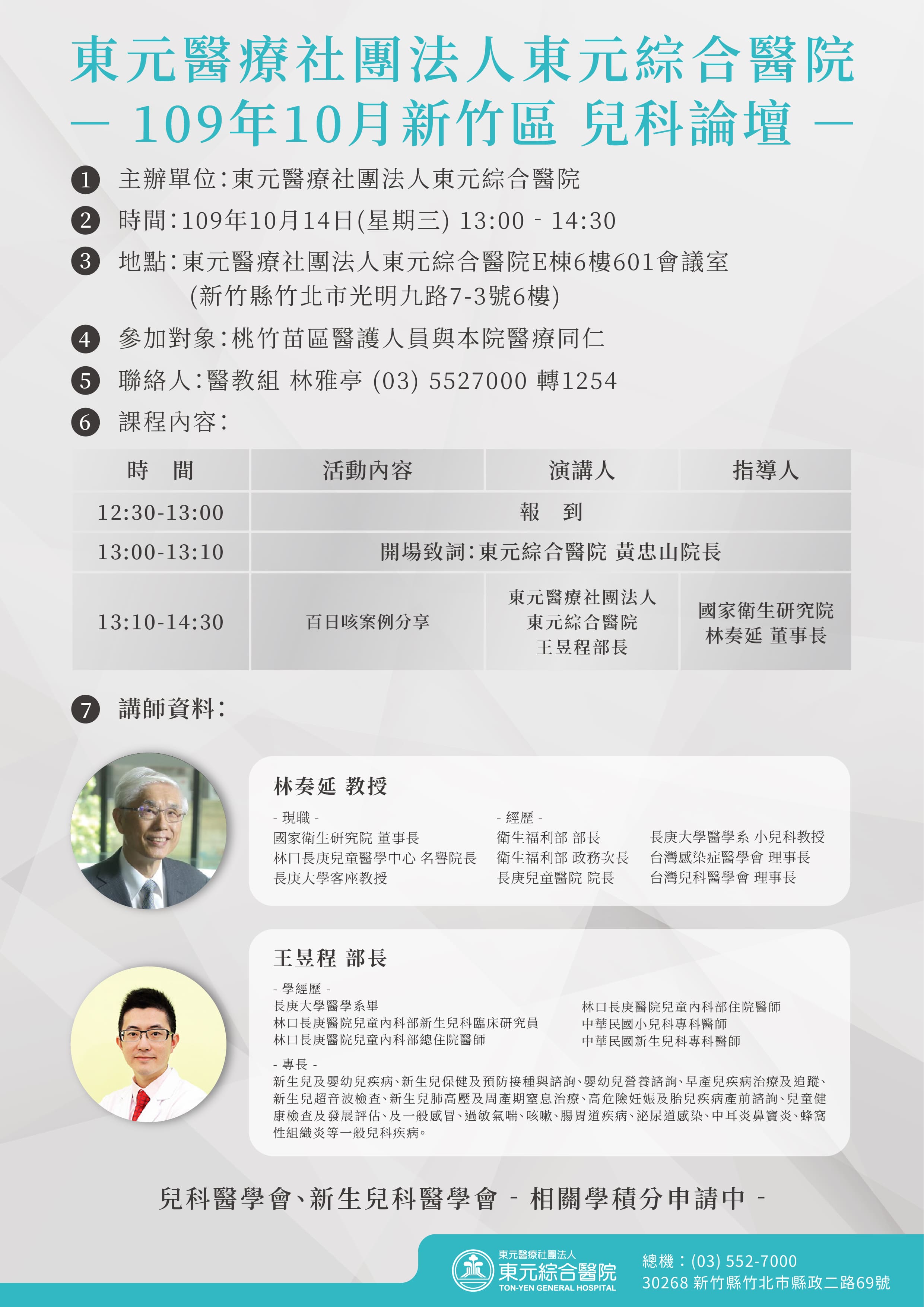109年10月14日「109年10月新竹區兒科論壇-百日咳案例分享」-東元綜合醫院