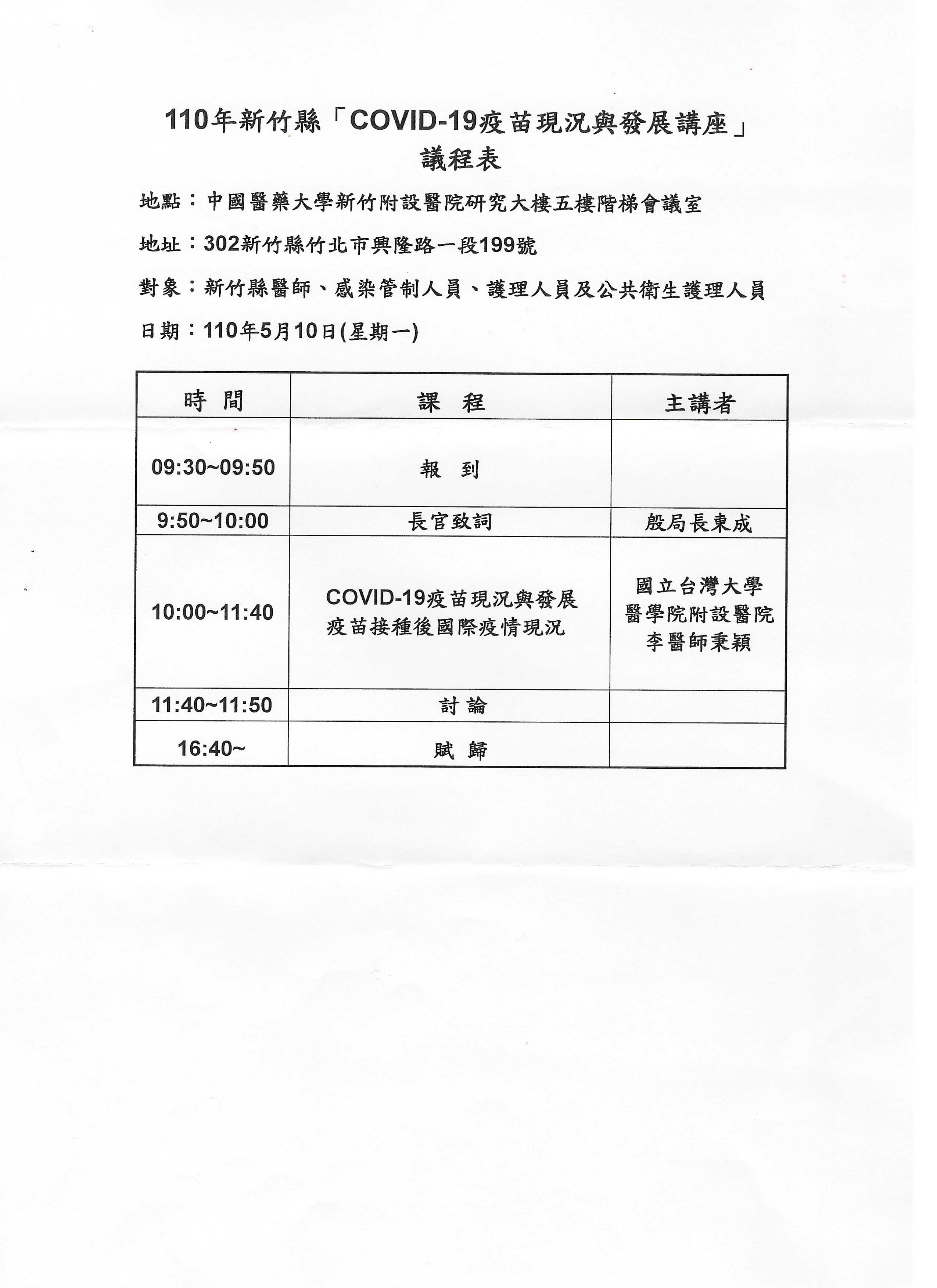 110年5月10日「新竹縣COVID-19疫苗現況與發展講座」-新竹縣政府衛生局 |