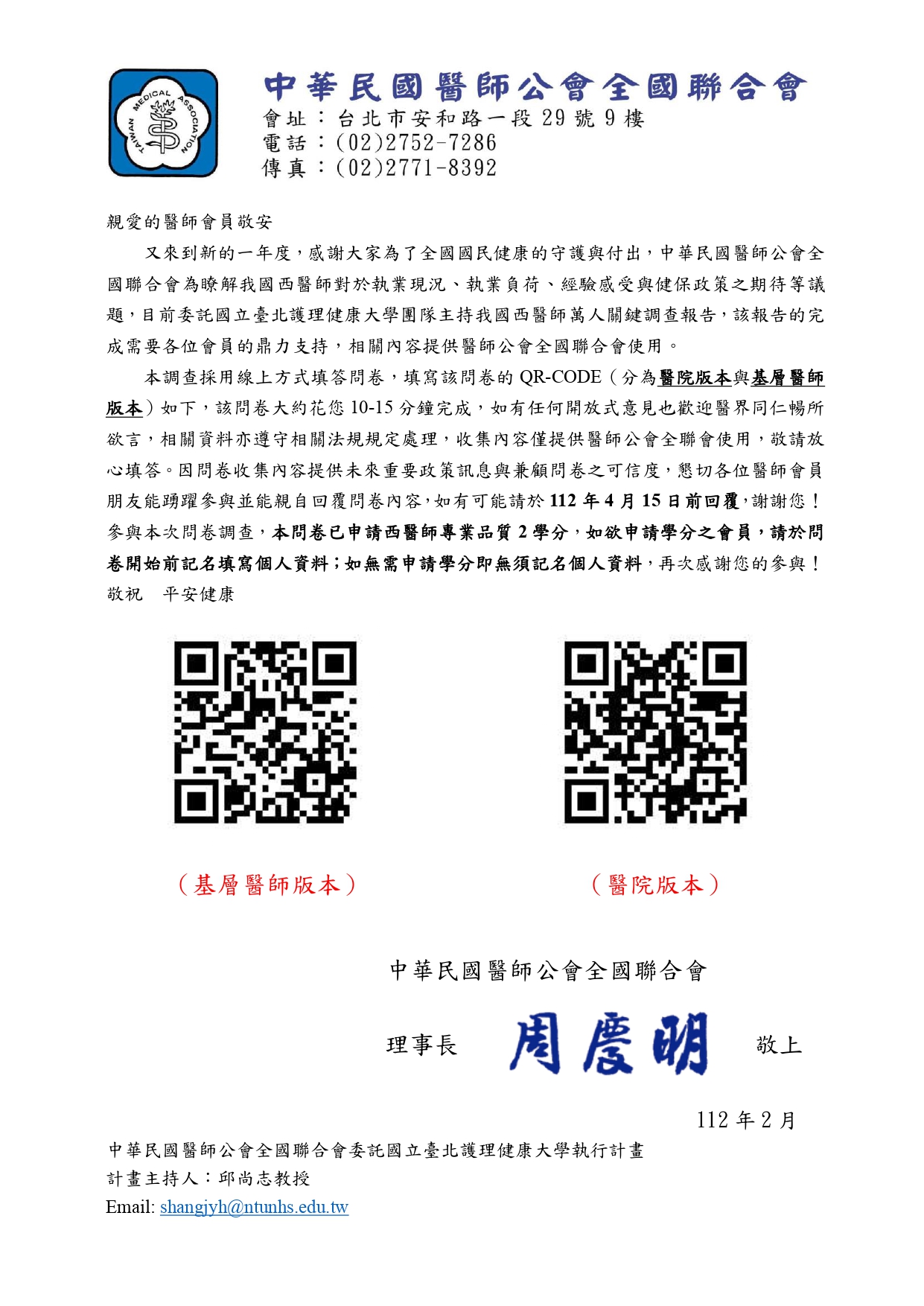 即日起至112年4月15日「我國西醫師萬人關鍵調查報告」問券調查-全聯會