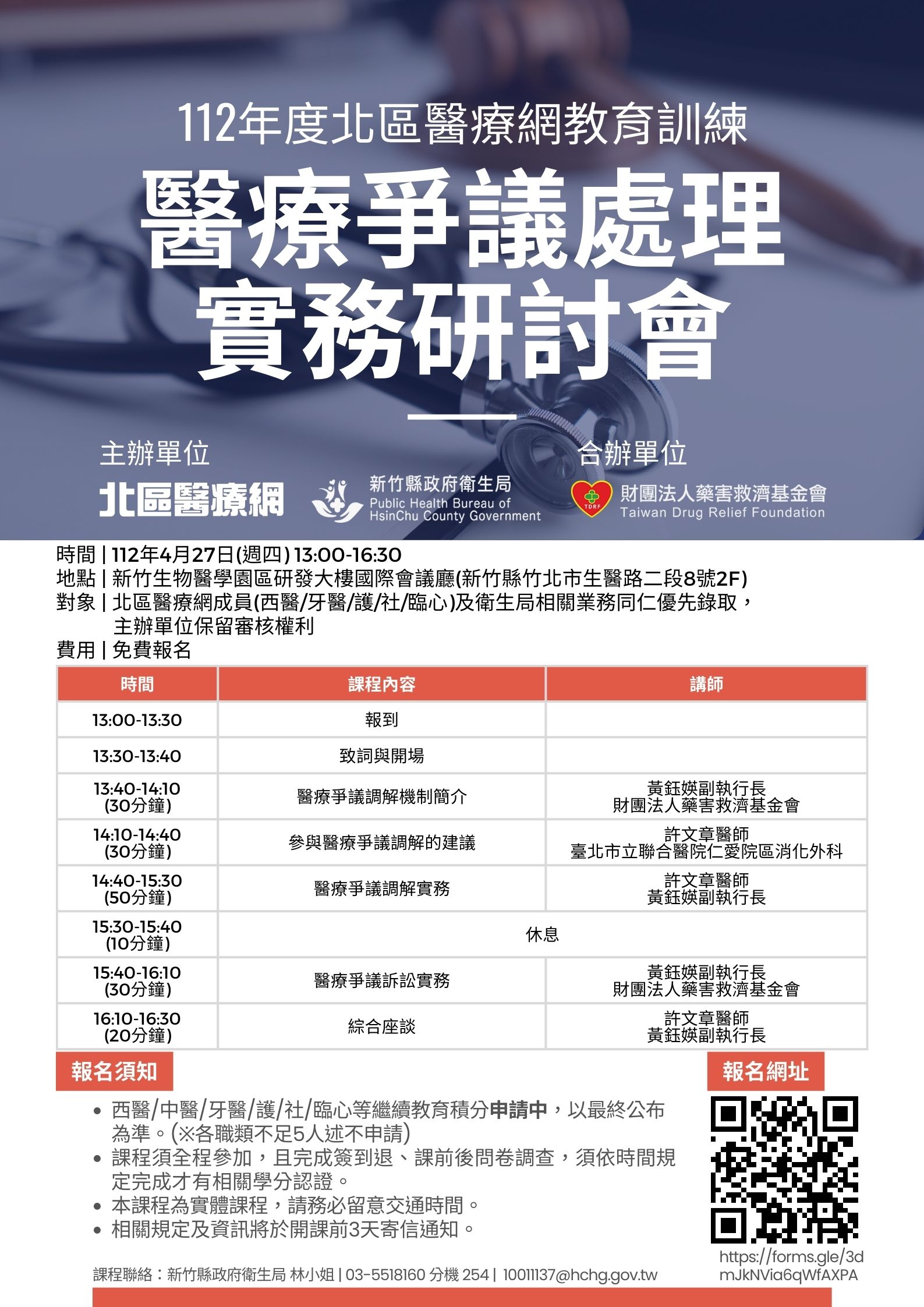 112年4月20日、4月27日『112年度北區醫療網教育訓練「醫療糾紛關懷實務研討會(直播課程)」及「醫療爭議處理實務研討會(實體課程)」』-新竹縣政府衛生局、財團法人藥害救濟基金會 |