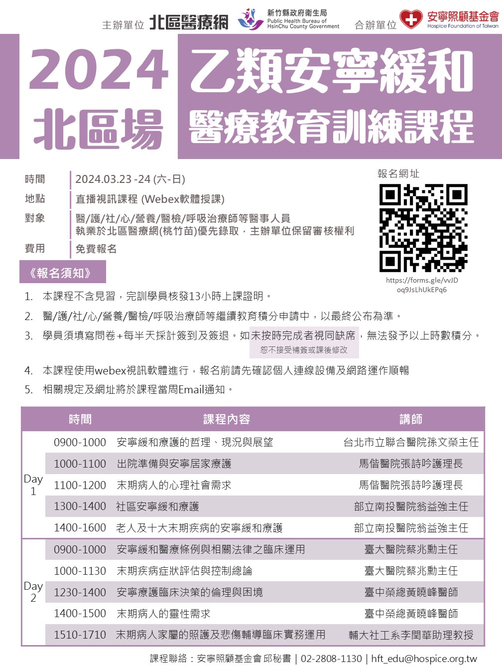 | 112年3月23-24日「2024年乙類安寧緩和醫療教育訓練課程(北區場)」視訊課程-新竹縣政府衛生局、台灣安寧基金會 |