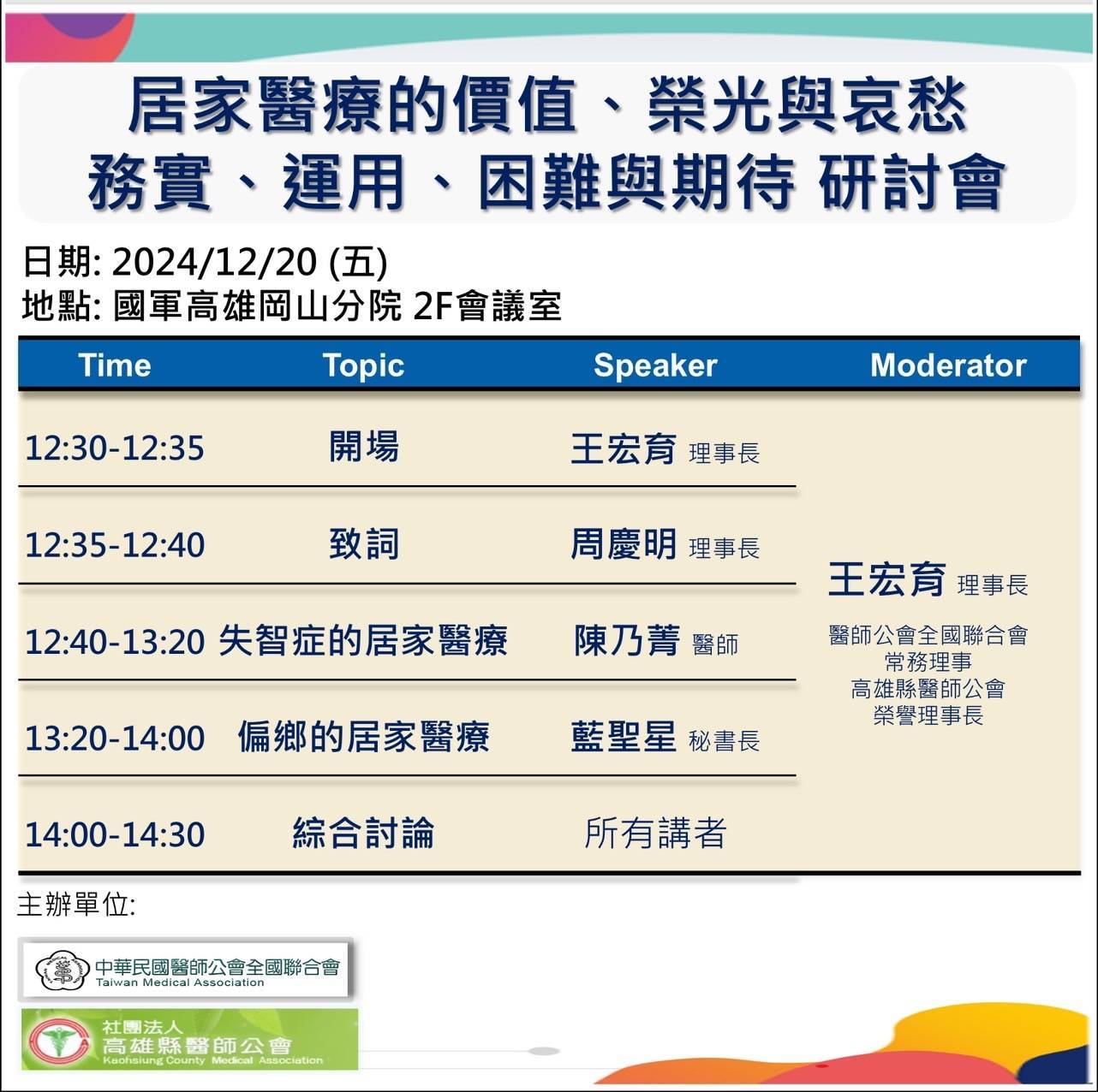 | 113年12月20日「居家醫療的價值、榮光與哀愁--務實、運用、困難與期待:1.失智症的居家醫療2.偏鄉的居家醫療」線上直播課程-高雄縣醫師公會 | ||||||||||||||