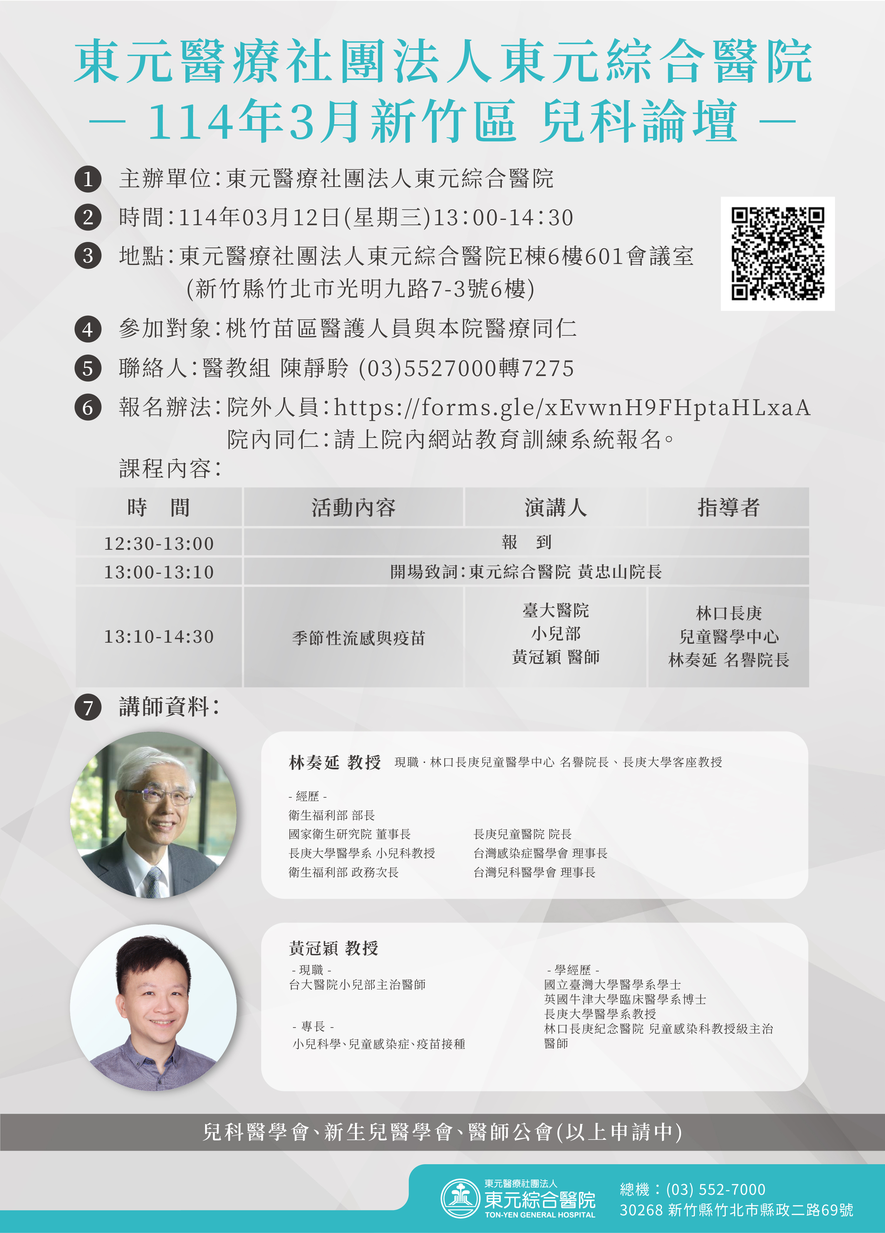 114年3月12日「114年3月新竹區兒科論壇」-東元醫療社團法人東元綜合醫院 |