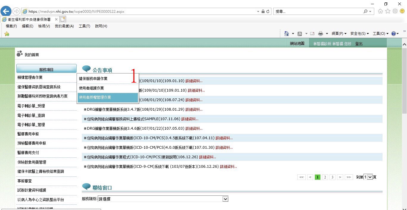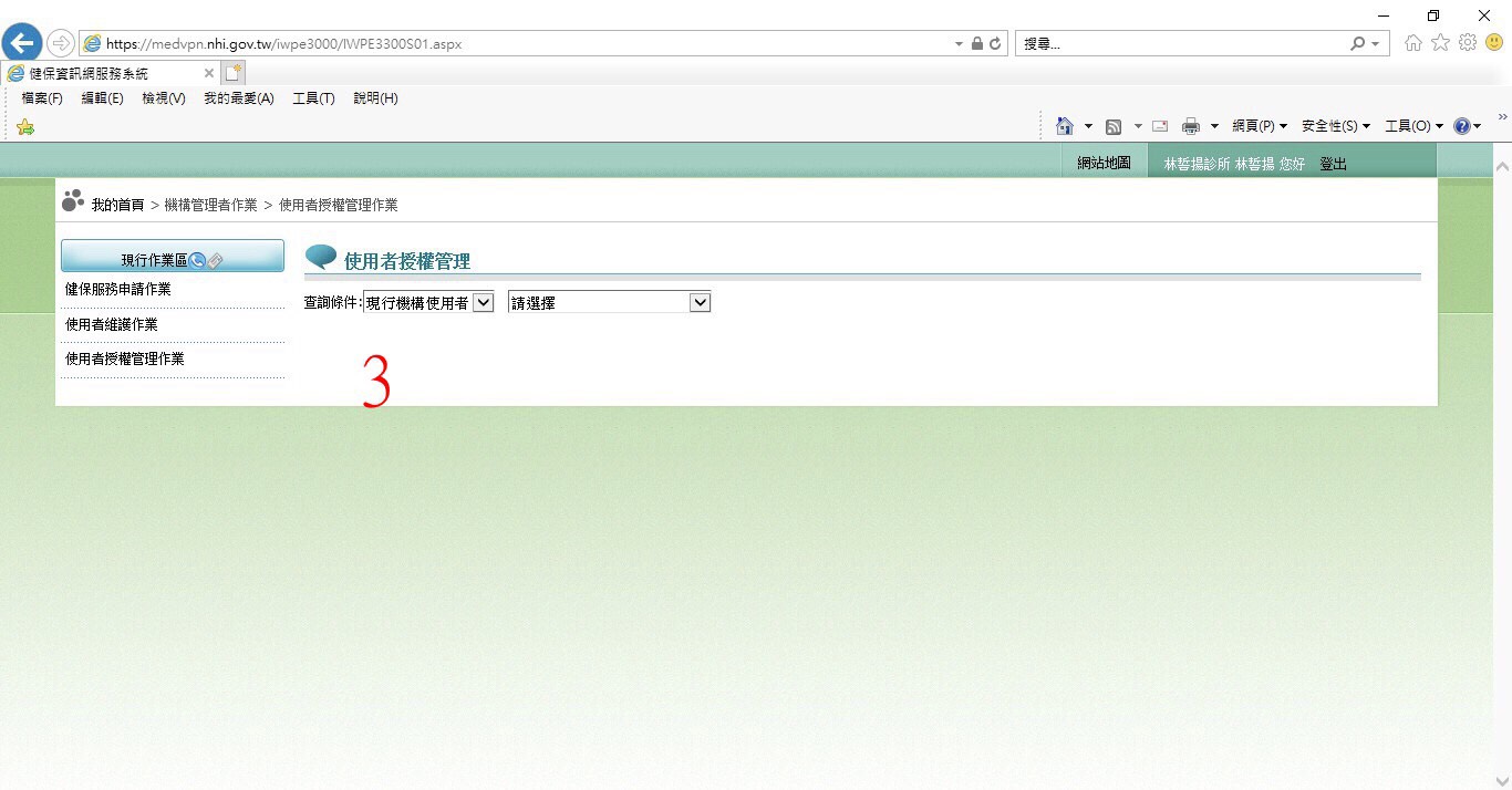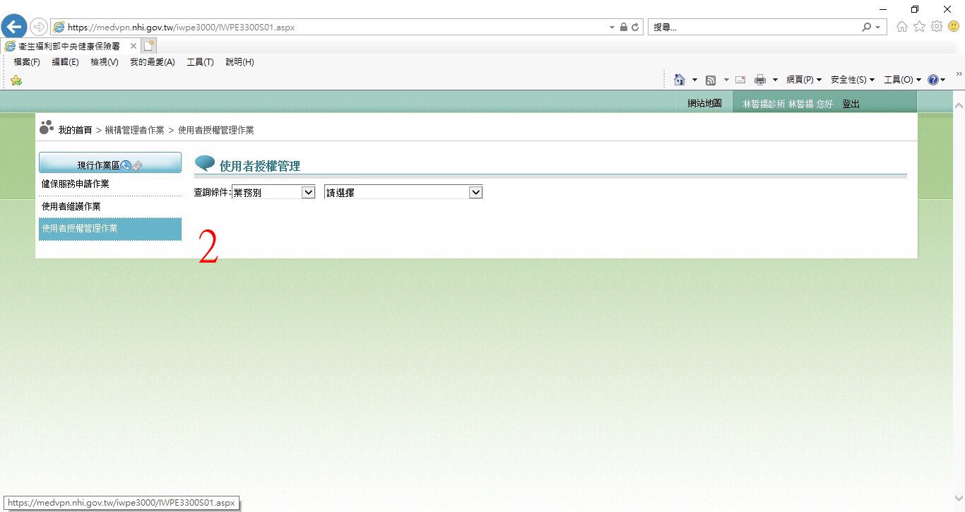 無健保卡查詢入境、接觸史資料,需由VPN首頁機構管理者先進行人員授權作業,授權步驟畫面如下: 1. 機構管理者作業
