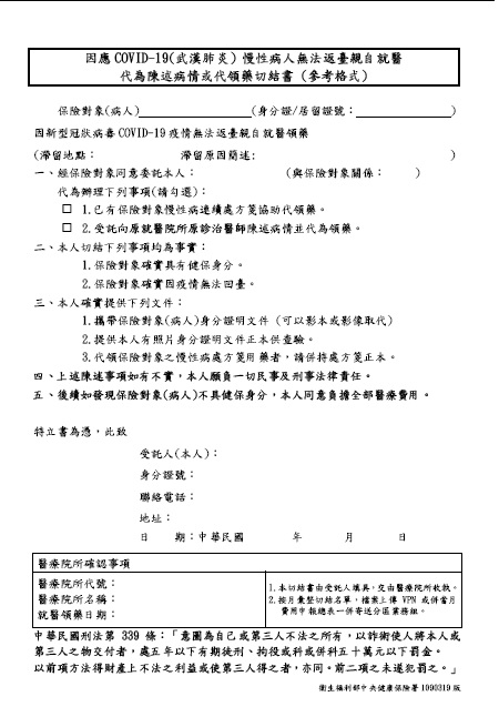 慢性病人委託他人代為陳述病情或代領藥事項,原僅針對滯留「中港澳地區」,考量疫情變化,已調整為「中央疫情指揮中心公布國際旅遊疫情警告3級或交通限制地區」,檢附今日發函(如下圖),切結書可於本署全球資訊網:首頁>重要政策>武漢肺炎就醫領藥>因疫情無法返台慢性病人領取長期慢性病用藥作業項下載。