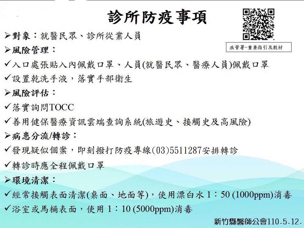 因應疫情升高,再次宣達防疫重要資訊,請各會員提高警覺。 本縣防疫專線TEL : (03)5511287。若有疑似病例,建議採檢者,即撥打此防疫專線。