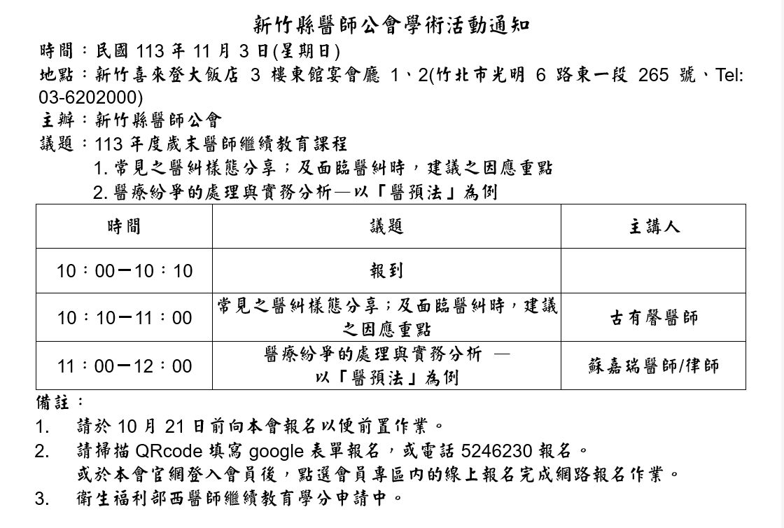 | 113年醫師節慶祝餐會暨歲末醫師繼續教育課程開始接受報名,請會員於10/21前報名。 | 2024-10-11 |