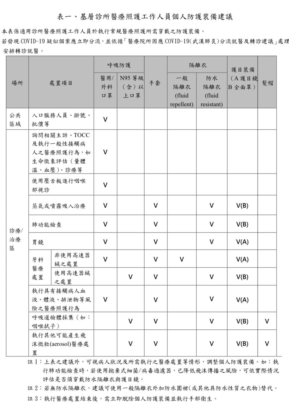 三、執行較危險診療項目的醫護人員請参閱ㄑ 附表〉 ,個別診療項目必須依此表做好防護,並應注意正確使用相關防護裝備及落實手部衞生。